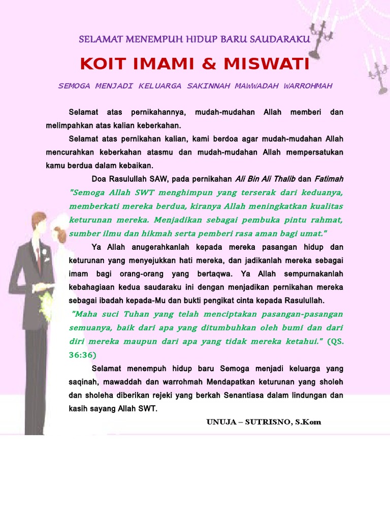 Selengkapnya dibawah ini 1 ucapan selamat pernikahan islami. Selamat menempuh hidup baru semaga bahagia selalu banyak rejeki dan banyak anak yang cakep2 n yang cantik2 dan langgeng sampai kakek dan nenek. Misalnya saja untuk atasan di kantor atau rekan kerja. Ucapan pernikahan islami formal.